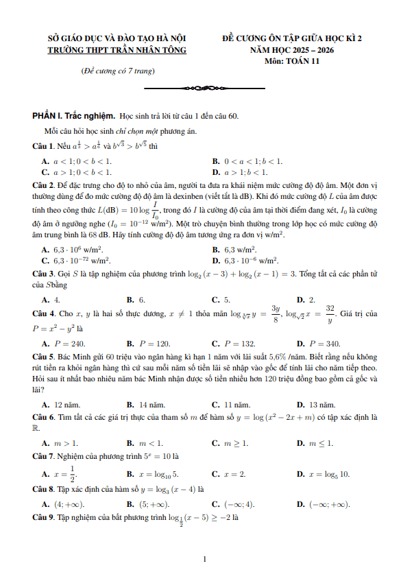 Đề cương giữa kì 2 Toán 11 năm 2025 – 2026 trường THPT Trần Nhân Tông – Hà Nội 14/02/2026