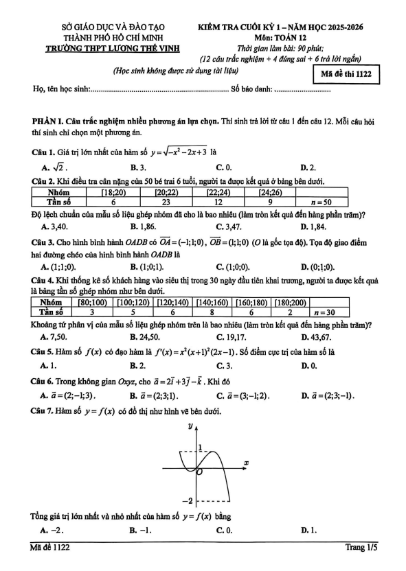 Đề cuối kỳ 1 Toán 12 năm 2025 – 2026 trường THPT Lương Thế Vinh – TP HCM 17/12/2025