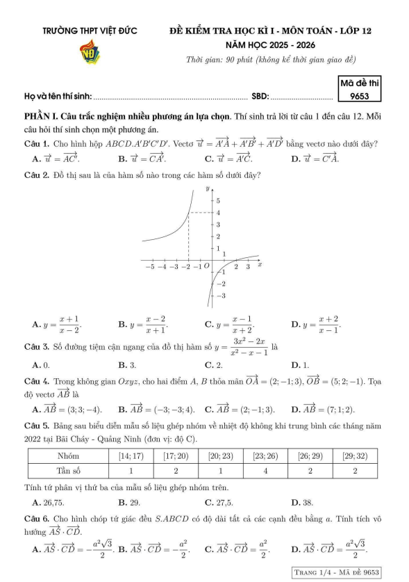 Đề học kì 1 Toán 12 năm 2025 – 2026 trường THPT Việt Đức – Hà Nội 17/12/2025