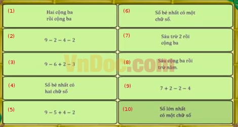 Trả lời:... < ... < ... < ... < ... < ... < ... < ... < ... < ...6 < 2 < 3 < 9 < 8 < 5 < 7 < 1 < 10 < 4||(6) < (2) < (3) < (9) < (8) < (5) < (7) < (1) < (10) < (4)Câu 1: 9 - 4 = 9 - ...... + 1Trả lời:5
