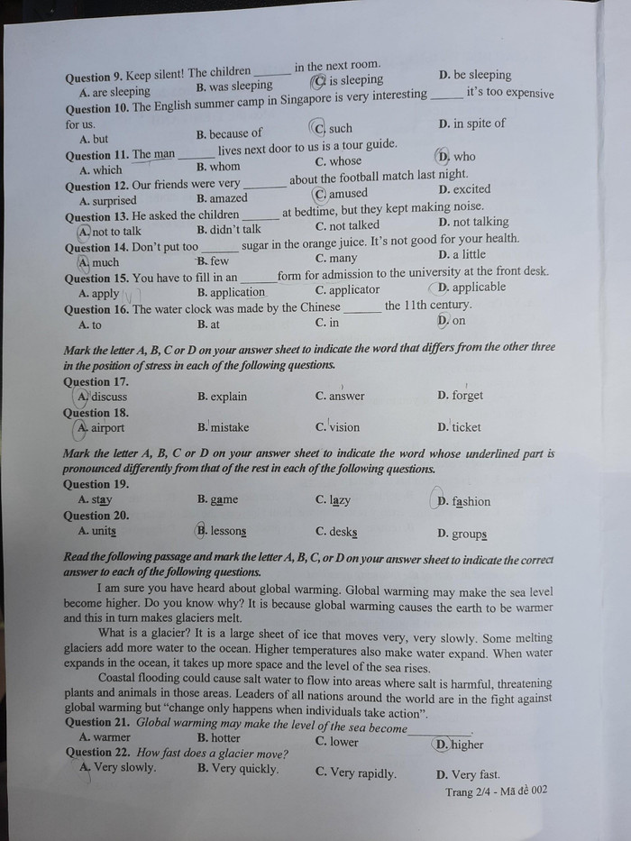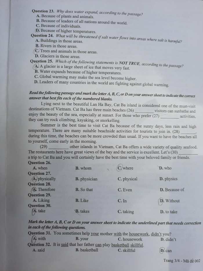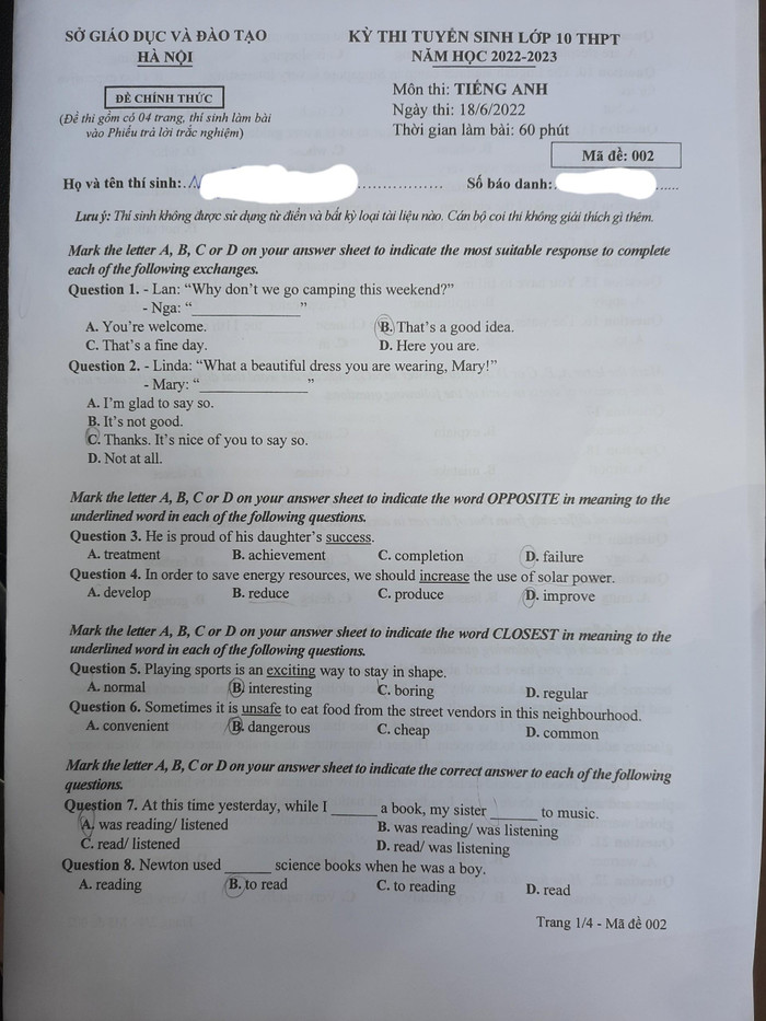 | Đề thi môn tiếng Anh vào 10 ở Hà Nội (mã đề 002). Ảnh: Trần Lý |