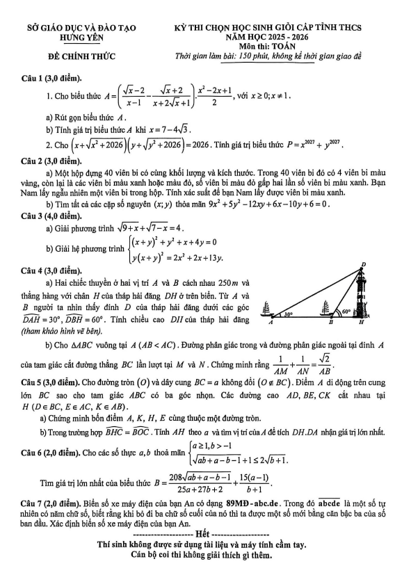 Đề chọn học sinh giỏi tỉnh Toán THCS năm 2025 – 2026 sở GD&ĐT Hưng Yên 29/01/2026