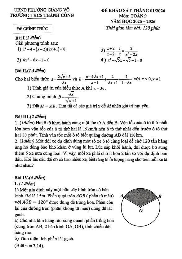 Đề khảo sát Toán 9 tháng 1 năm 2026 trường THCS Thành Công – Hà Nội 29/01/2026