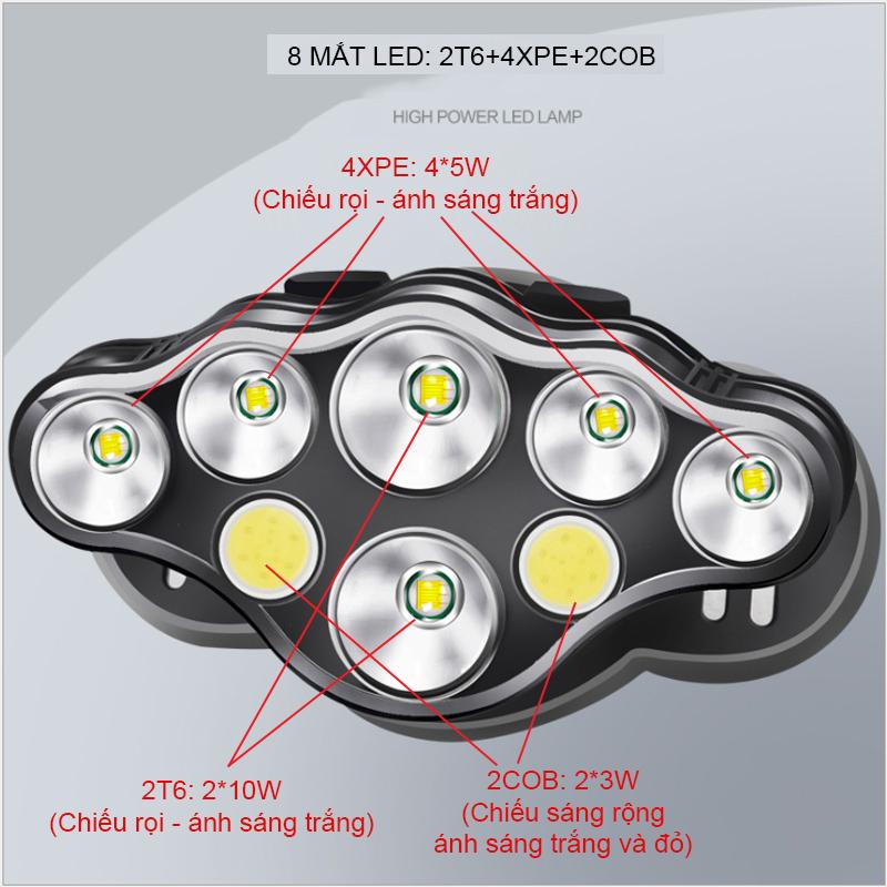 Đèn Pin LED đội đầu Siêu Sáng 8 Bóng Led (2T6+4XPE+2COB) - Tiki