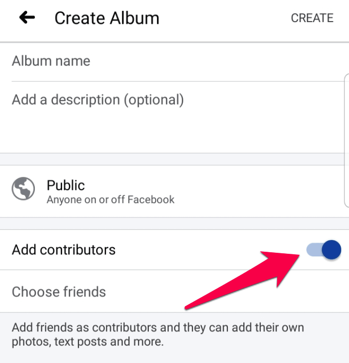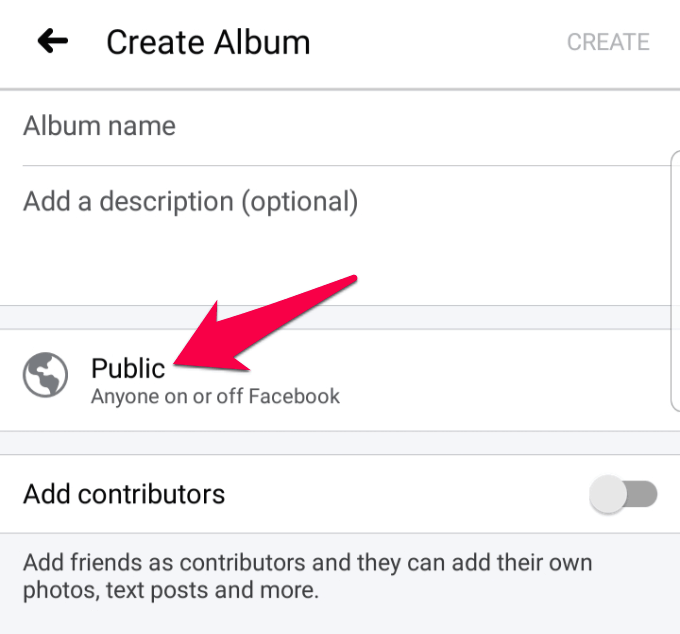 - Đặt tiêu đề, mô tả hoặc vị trí cho album. Bạn cũng có thể gắn thẻ bạn bè hoặc gia đình của mình, thêm cộng tác viên và chọn người có thể xem ảnh trong album. Ví dụ, bạn có thể chọn Bạn bè, Công chúng và như thế.