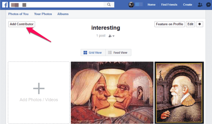 - Để tạo một album được chia sẻ, hãy chuyển đến một album và ở phía trên bên trái, hãy tìm và nhấp vào Thêm người đóng góp.