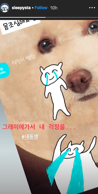 Jin cùng BTS đã bước lên sân khấu lễ trao giải Grammy lần đầu tiên vào ngày 10/2 (theo giờ địa phương ở Mỹ) và trở thành nghệ sĩ K-Pop đầu tiên được mời tham dự Grammy với tư cách người trao giải. Buổi lễ kết thúc vào khoảng thời gian mà Sleepy chia sẻ ảnh chụp màn hình của mình.