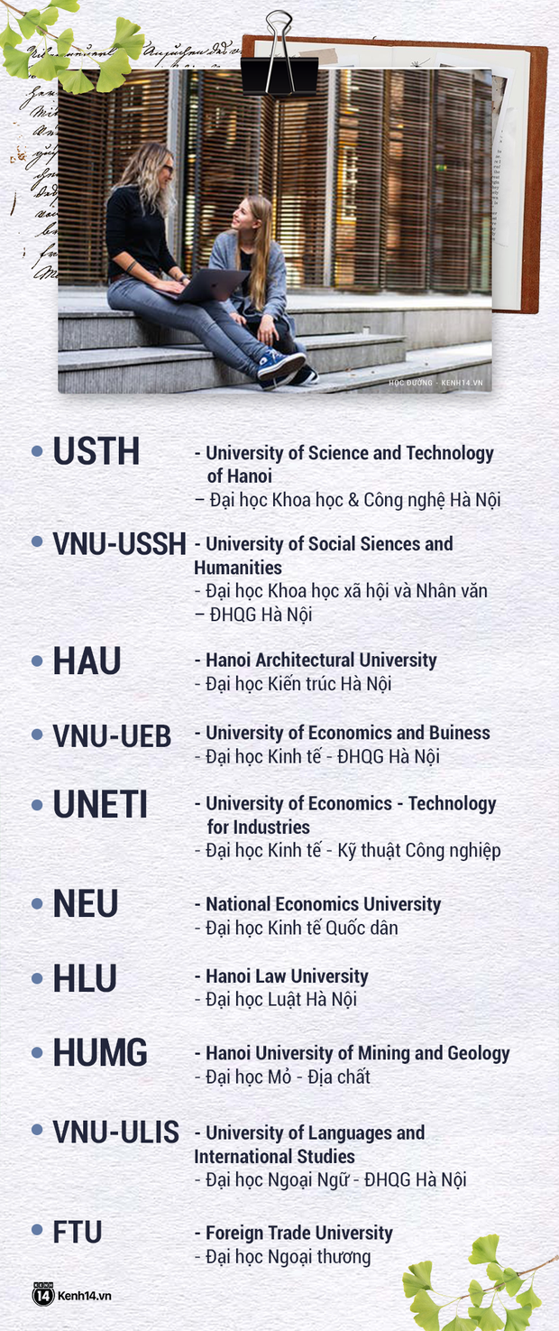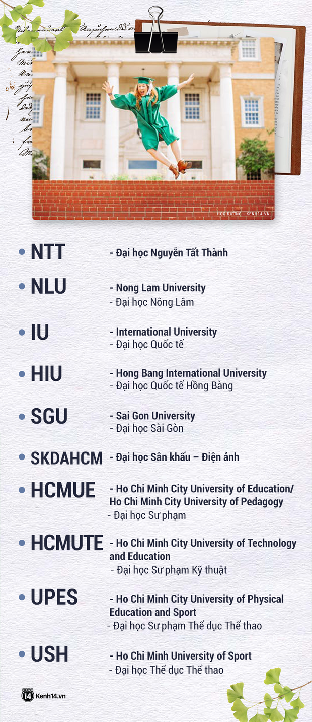 0 0 Nhìn chung tên tiếng Anh của một số trường đại học của nước ta vẫn còn chưa chuẩn xác và gây nhiều tranh cãi.Dù cùng tên tiếng Việt, cùng ngành học nhưng tên tiếng Anh của một số trường ở phía Bắc và phía Nam lại rất khác nhau. Điển hình, ĐH Công nghiệp Hà Nội lấy tên "Hanoi University of Industry" (HUI), trong khi ĐH Công nghiệp TPHCM lại là "Industrial University of Ho Chi Minh City" (IUH).Một số trường dù khác nhau về tên tiếng Việt, nhưng lại có tên viết tắt hay bị nhầm lẫn. Điển hình và thường gặp nhất là trường hợp của UEH (Kinh tế) - UEL (Kinh tế - Luật) - UEF (Kinh tế - Tài chính). Đem tên viết tắt của 3 trường đại học này đi hỏi sinh viên khắp TPHCM thử xem, nhiều người sẽ không phân biệt được!Dưới đây là ý nghĩa tên viết tắt tiếng Anh của một số trường đại học tại 2 khu vực Hà Nội và TPHCM.KHU VỰC TP.HCM