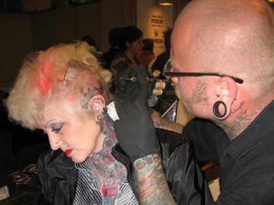 Cận cảnh mắt đã nhuộm màu.2. Cụ bà có nhiều hình xăm nhất trên thế giớiĐó là bà Isobel Varley, người Anh. Ít ai nghĩ rằng hình xăm đầu tiên của bà được thực hiện khi bà đã ngoài 50 tuổi, đó là hình xăm 1 cành hoa hồng sau gáy. 11 năm sau, năm 1997, số lượng hình xăm của bà Isobel đã gần như phủ kín khắp cơ thể, bà chỉ không xăm vào lòng bàn chân, lòng bàn tay và trên khuôn mặt. Mới đây bà đã cạo hết tóc để xăm hình lên cả phần đầu của mình. Tuy đã ngoài 70 nhưng bà Isobel vẫn rất năng động với những tour diễn vòng quanh thế giới.