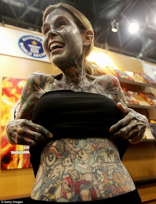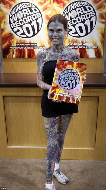 Chân dung 1 con người kỳ lạ.5. Cô gái có nhiều hình xăm nhất thế giớiĐó là Julia Gnuse, người mới đây nhất đã được tổ chức kỷ lục Guinness thế giới công nhận là cô gái có nhiều hình xăm trên cơ thể nhất. Julia đã xăm tới 95% cơ thể của mình với những hình hoa văn, những nhân vật hoạt hình và diễn viên mà cô yêu thích.