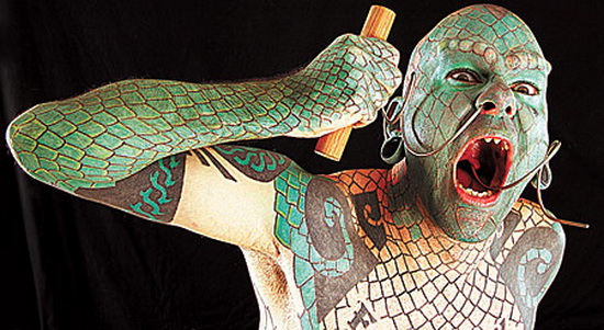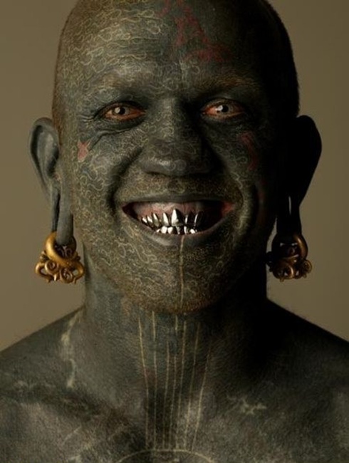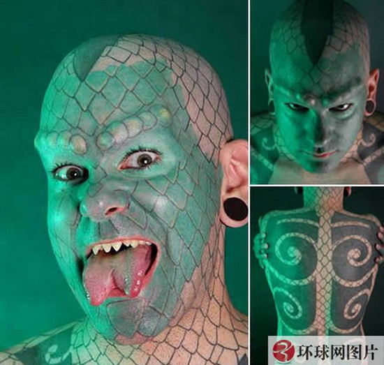 Xăm hình ở khắp mọi nơi trên cơ thể.6. Người thằn lằnNgười đàn ông tên là Erik Sprague này sinh năm 1972 đến từ Texas, Mỹ. Anh ta được mọi người gọi là người thằn lằn với bộ da được xăm hình rất ấn tượng mô phỏng theo da của loài thằn lằn. Anh ta đã phải mất tới hơn 700 giờ liên tục để xăm được trên toàn bộ cơ thể của mình. Ngoài việc xăm hình, Erik đã mài răng nhọn, cấy “sừng” lên trán và phẫu thuật lưỡi chẻ đôi để có được 1 diện mạo mới giống như thằn lằn.