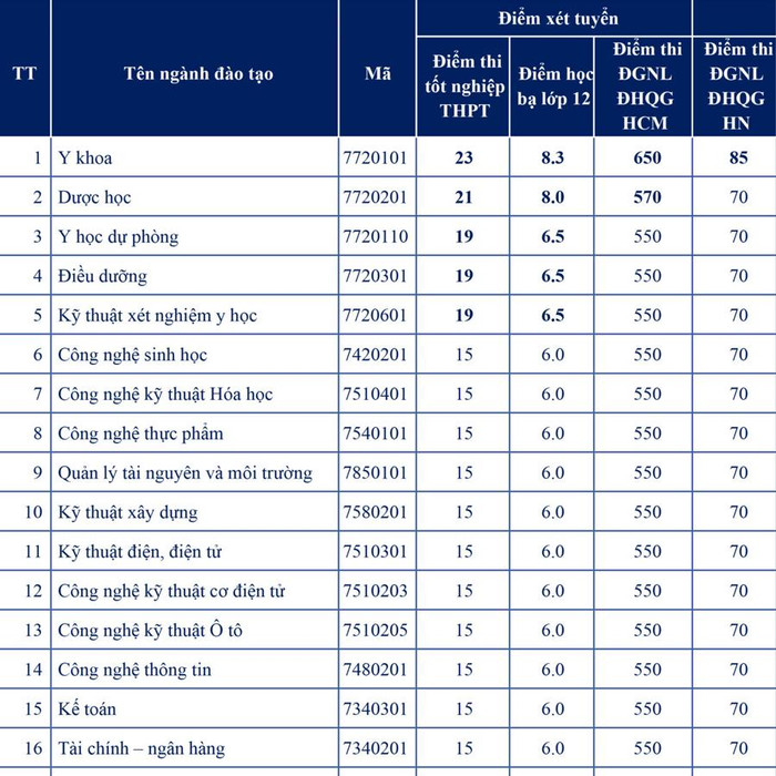 Cụ thể, mức điểm nhận hồ sơ xét tuyển vào các ngành đều là 15 điểm. Riêng các ngành thuộc khối Sức khỏe: Y khoa là 23 điểm; Dược học là 21 điểm; Y học dự phòng, Điều dưỡng, Kỹ thuật xét nghiệm y học đều là 19 điểm.