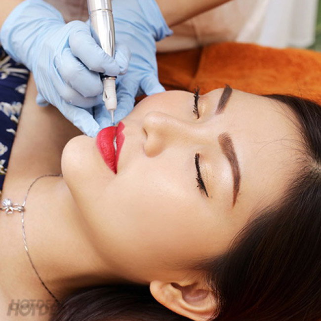 Bước 4: Tiến hành phun xăm môi: Chuyên viên sẽ tiến hành phun môi, xăm môi một cách tỉ mỉ chi tiết. Chỉ mất 30-40 phút để có đôi môi căng bóng, bền đẹp tự nhiên.
