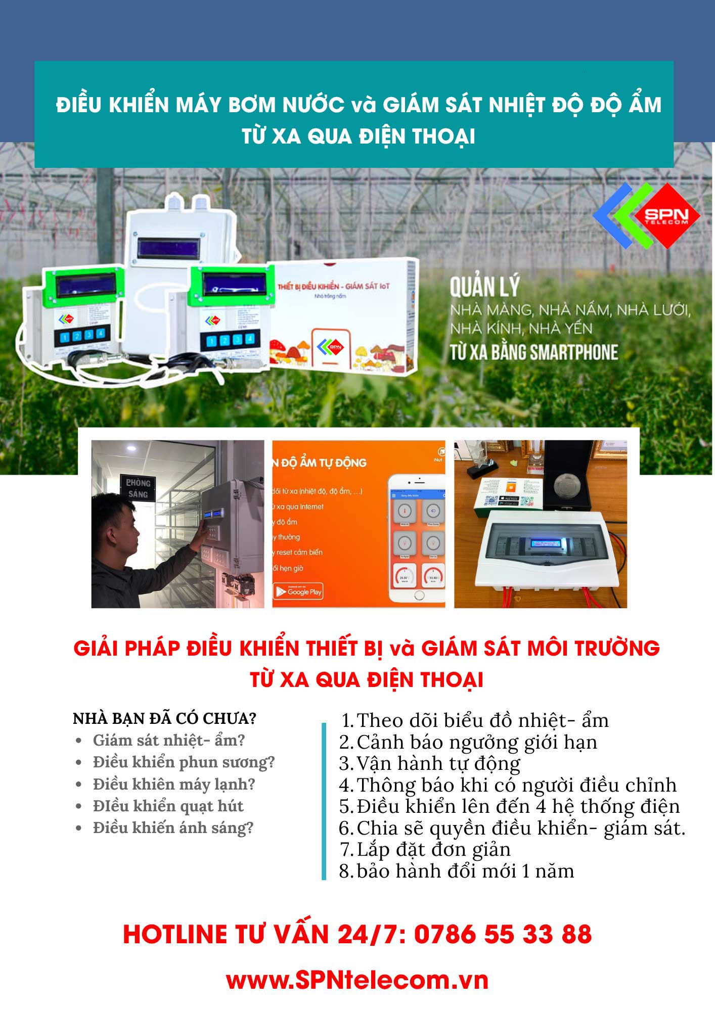 và rất nhiều hệ thống bơm tưới khác đều cần thiết tích hợp bộ điều khiển bật tắt máy bơm từ xa của SPN Telecom để tối ưu hóa vận hành, giám sát nhiệt độ độ ẩm môi trường đề đảm bảo chất lượng nông nghiệp đạt năng suất tốt nhất