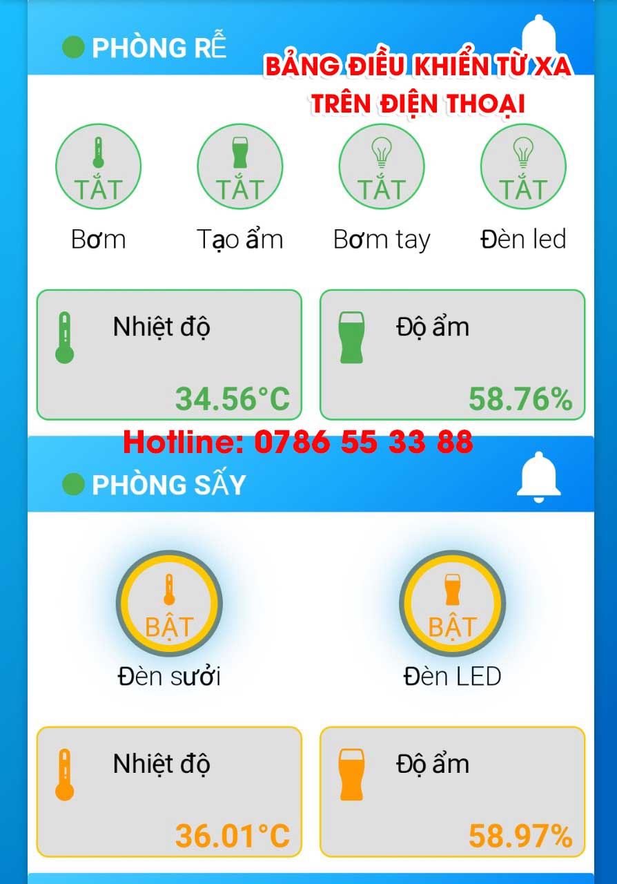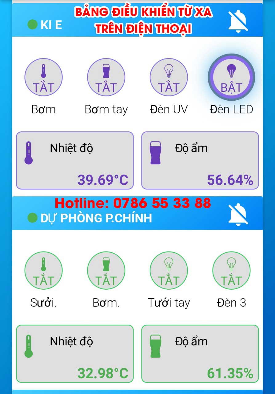 - Giám sát nhiệt độ độ ẩm và điều khiển tự động từ xa 100% bằng điện thoại thông minh