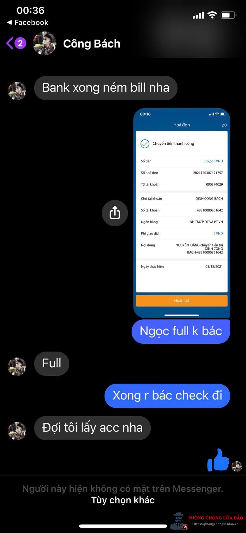 Ok Đinh Công Bách - Lừa đảo 555k tiền mua bán acc game Liên Quân 0Nick fb Đinh Công Bách là chủ của group Mua Bán - Trao Đổi Acc Liên Quân Mobile Uy Tín + Chất Lượng ✔️ đứng ra làm trung gian mua bán acc, nhưng nó là thằng trùm lừa đảo. Mình chuyển 555k cho nó để mua acc game Liên Quân full ngọc, qua số tài khoản 48310000851642 - DINH CONG BACH Sau khi nó nhận được tiền thì nó block mình. Số điện thoại của nó: 0924842735