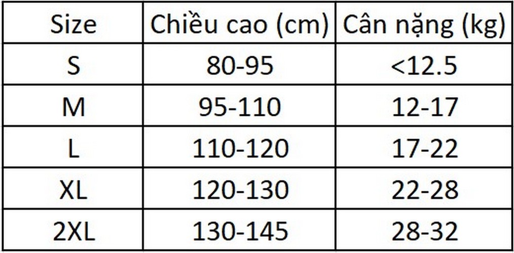 Quý khách tham khảo bảng size để lựa size phù hợp với bé