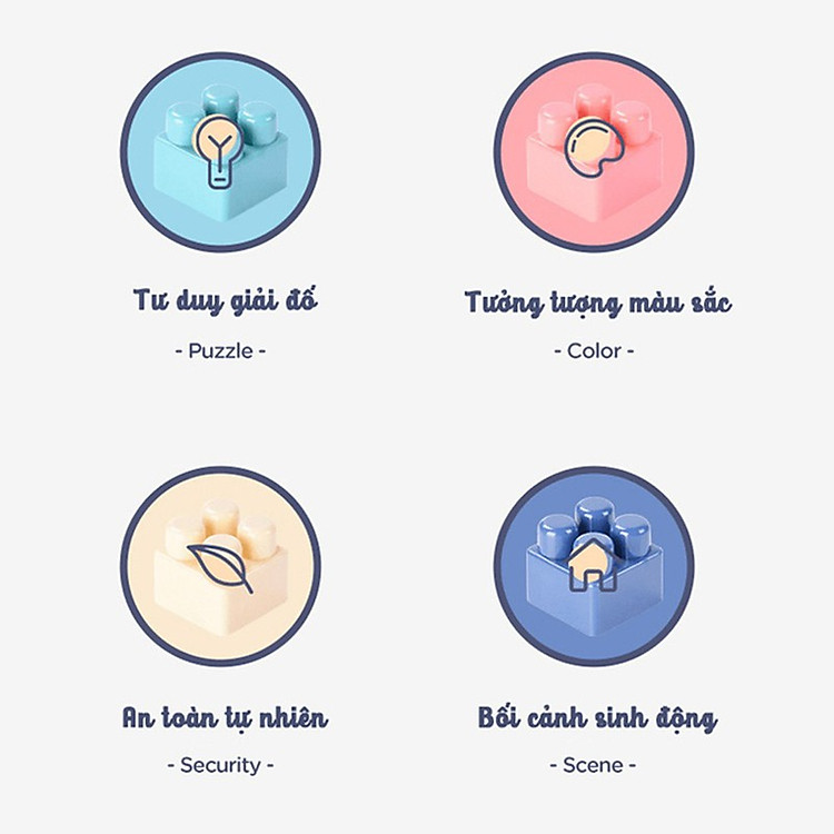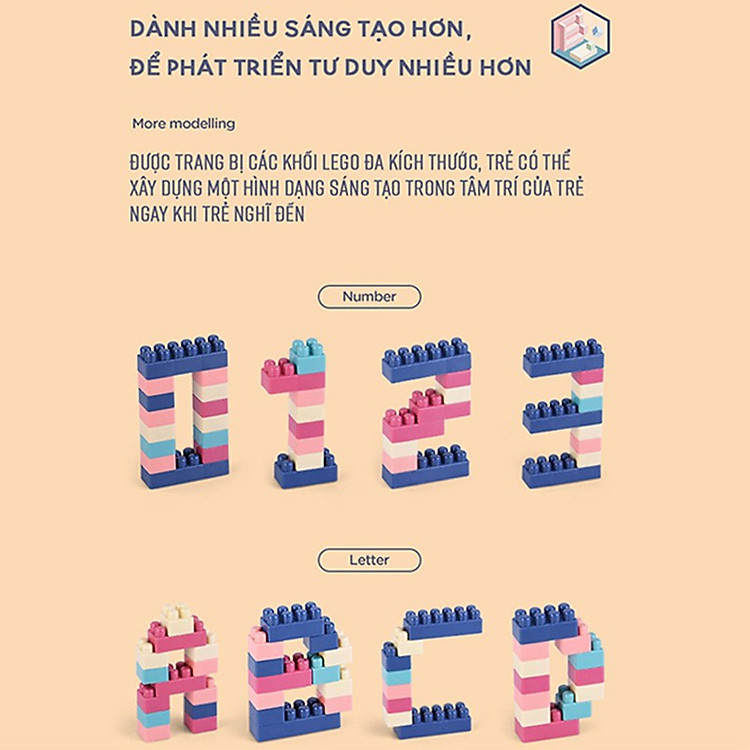 Màu sắc tươi sáng:– Màu sắc: nhiều màu sắc tươi sáng kích thích thị giác– Bộ mô hình sử dụng nhiều màu sắc tươi sáng như: đỏ, trắng, hồng, vàng, xanh… tăng khả năng kích thích thị giác giúp bé học cách phân biệt màu sắc tốt hơn.– Mô hình không đưa ra khuôn mẫu nên không giới hạn sức sáng tạo của bé. Nhờ đó, bé có thể phát huy khả năng tư duy, trí tưởng tượng phong phú thông qua những mẫu lắp ráp đa dạng của mình.– Sự phối hợp tay – mắt của bé sẽ trở nên linh hoạt hơn khi bé tháo lắp những mô hình này.– Không chỉ thích hợp sử dung cho các bé, mô hình cũng là món đồ chơi giải trí thú vị cho mọi thành viên trong gia đình bạn.