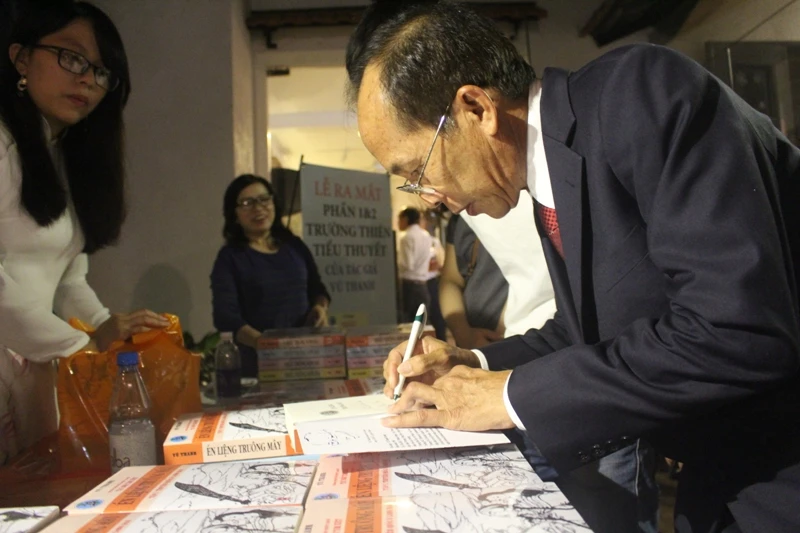 Nhà văn Vũ Thanh ký sách tặng người hâm mộ.