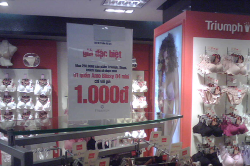 Triumph có chương trình giảm giá đặc biệt. Khách hàng khi mua từ 250.000 đồng trở lên các sản phẩm đồ lót của Triumph, Sloggi sẽ được mua 01 quần Amo Blissy 04 mini với giá chỉ 1000 đồng. Hãng thời trang đồ lót Bonbon cũng giảm giá 10 sản phẩm tới 50%. Theo đó, một chiếc áo lót có giá khoảng trên 100.000 đồng.