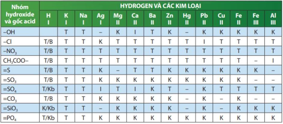 IV. Bảng tính tan trong nước của các Acid - Base -Muối