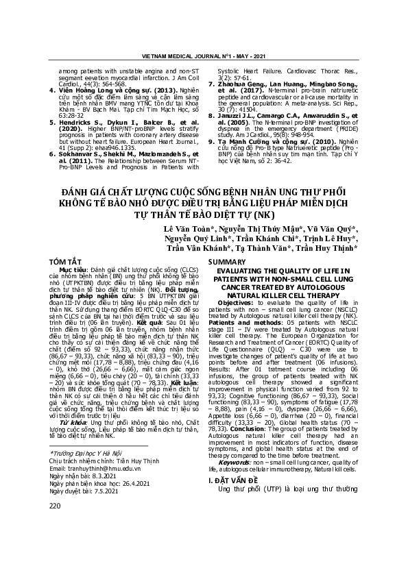 Đánh Giá Chất Lượng Cuộc Sống Bệnh Nhân Ung Thư Phổi Không Tế Bào Nhỏ Được Điều Trị Bằng Liệu Pháp Miễn Dịch Tự Thân Tế Bào Diệt Tự (NK)