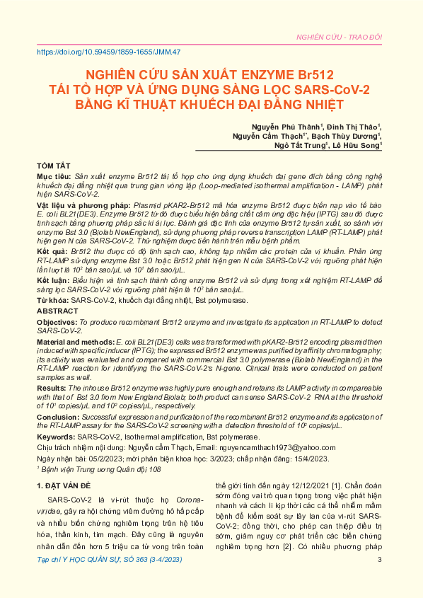 arrow_back_iosNGHIÊN CỨU SẢN XUẤT ENZYME Br512 TÁI TỔ HỢP VÀ ỨNG DỤNG SÀNG LỌC SARS-CoV-2 BẰNG KĨ THUẬT KHUẾCH ĐẠI ĐẲNG NHIỆTĐinh Thanh ThảodownloadDownload free PDFAbstract