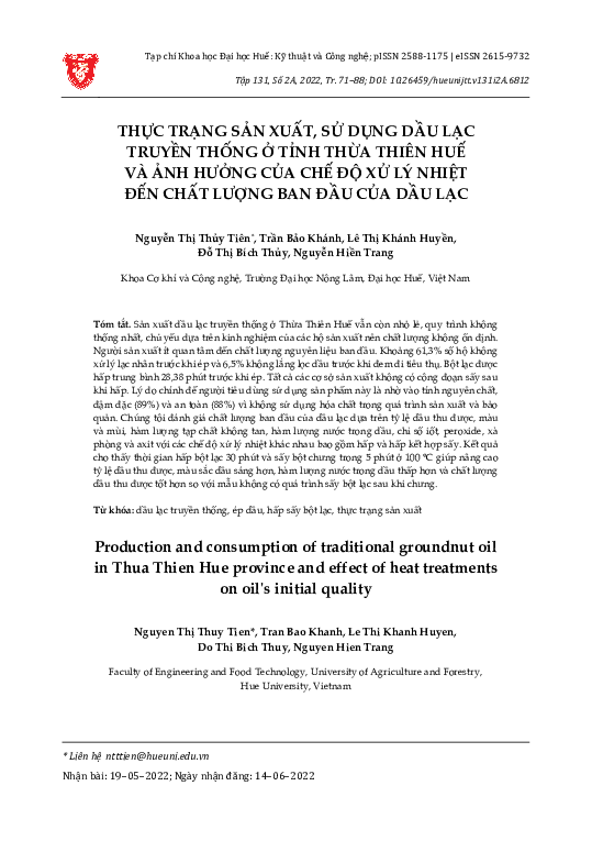 Le Bao Long 002029downloadDownload free PDFThực Trạng Sản Xuất, Sử Dụng Dầu Lạc Truyền Thống Ở Tỉnh Thừa Thiên Huế Và Ảnh Hưởng Của Chế Độ Xử Lý Nhiệt Đến Chất Lượng Ban Đầu Của Dầu Lạc
