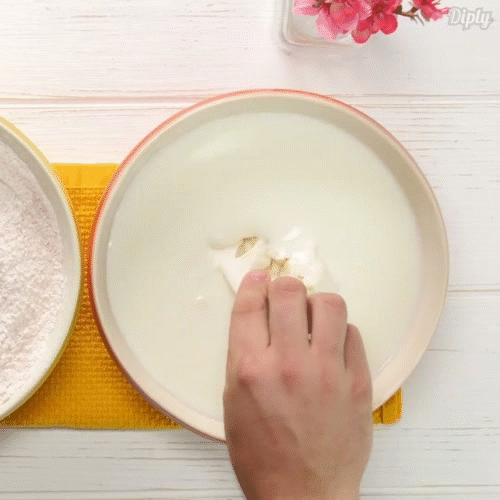 - Tiếp theo, hãy nhúng miếng súp lơ vào hỗn hợp bột chiên giòn ướt sau đó lăn đều với bột chiên khô như thế này nhé!