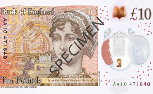 Tờ polymer mệnh giá 10 bảng mới in hình bà Jane Austen nhằm đánh dấu 200 năm kể từ khi bà qua đời vào năm 1817. Được công bố lần đầu tiên vào tháng 7, đồng 10 bảng mới cũng bao gồm hình ảnh Đại giáo đường Winchester, nơi bà Austen được an táng, cùng với dòng chữ trích trong cuốn tiểu thuyết “Kiêu hãnh và Định kiến”: “Tôi tuyên bố rốt cuộc không gì thích thú như việc đọc!”.