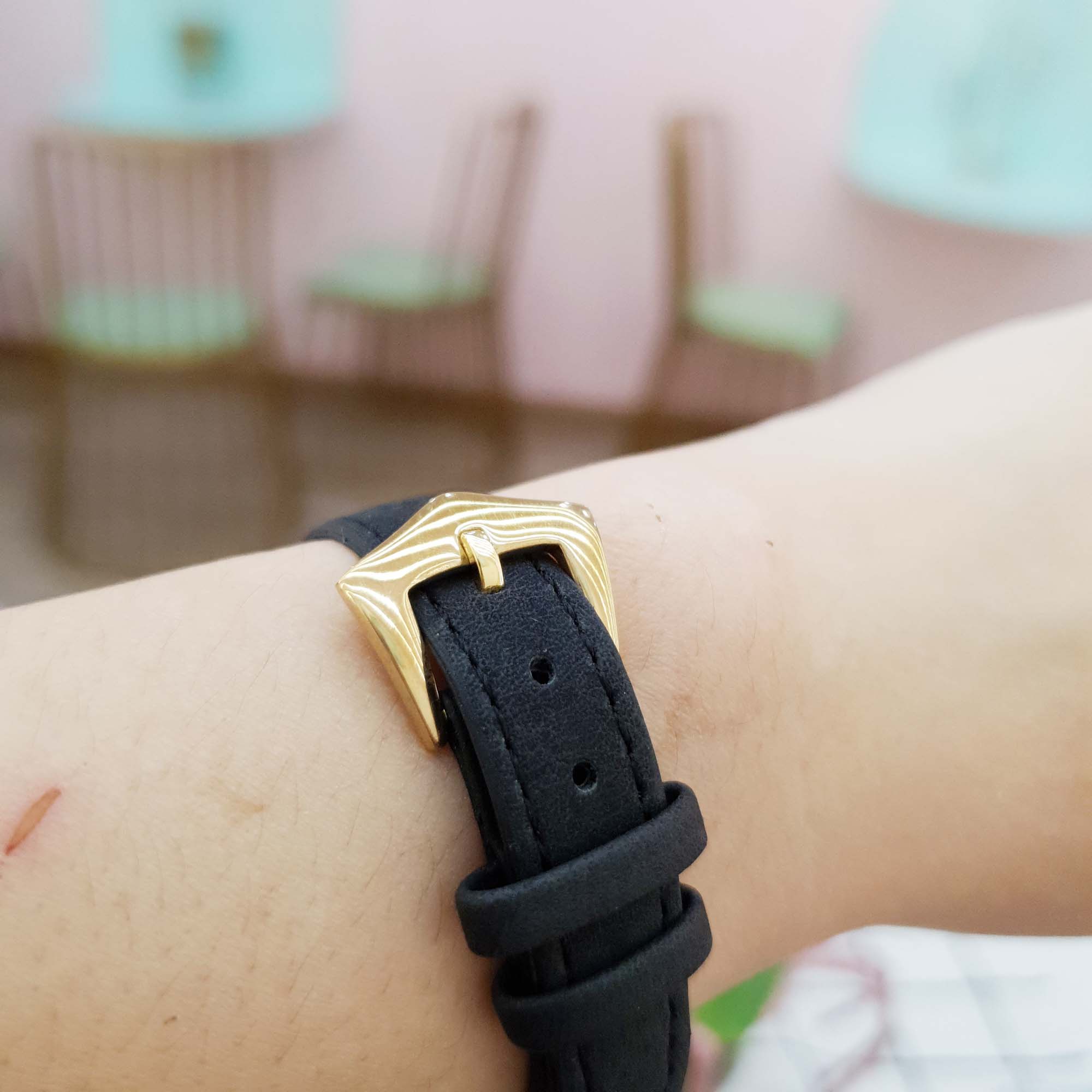 Dây da đồng hồ là dây da lộn nhưng cảm giác sờ rất mịn và đeo rất êm tay, mặt trong là lớp da bóng để không thấm mồ hôi tay khi đeo.