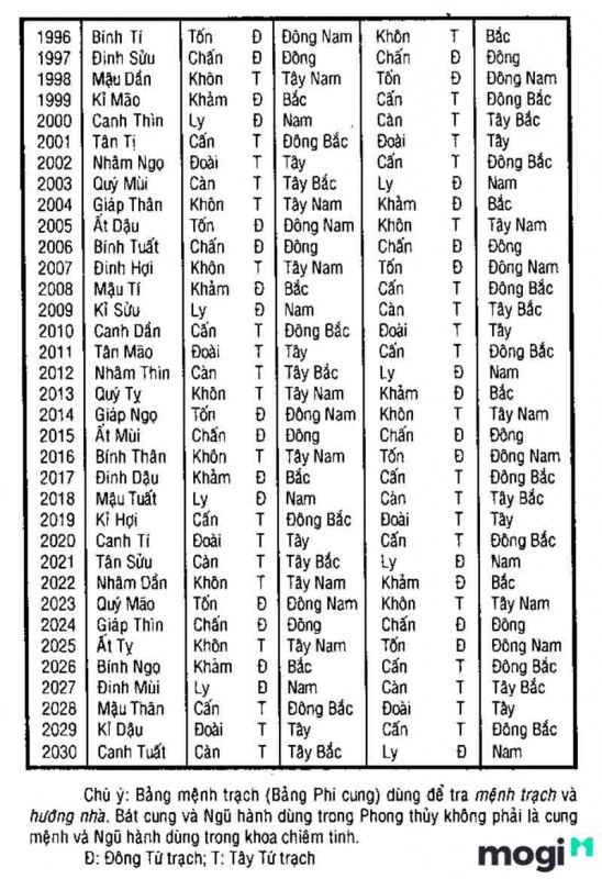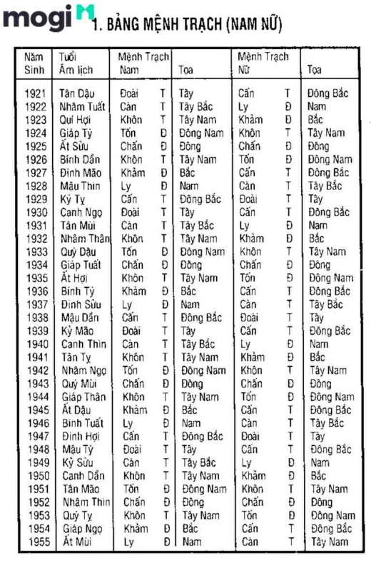 Để rút ngắn thời gian tính toán và lựa chọn hướng Tây Tứ Trạch và Đông Tứ Trạch cho gia chủ. Bạn cũng có thể tham khảo bảng tra cứu mệnh trạch dưới đây.