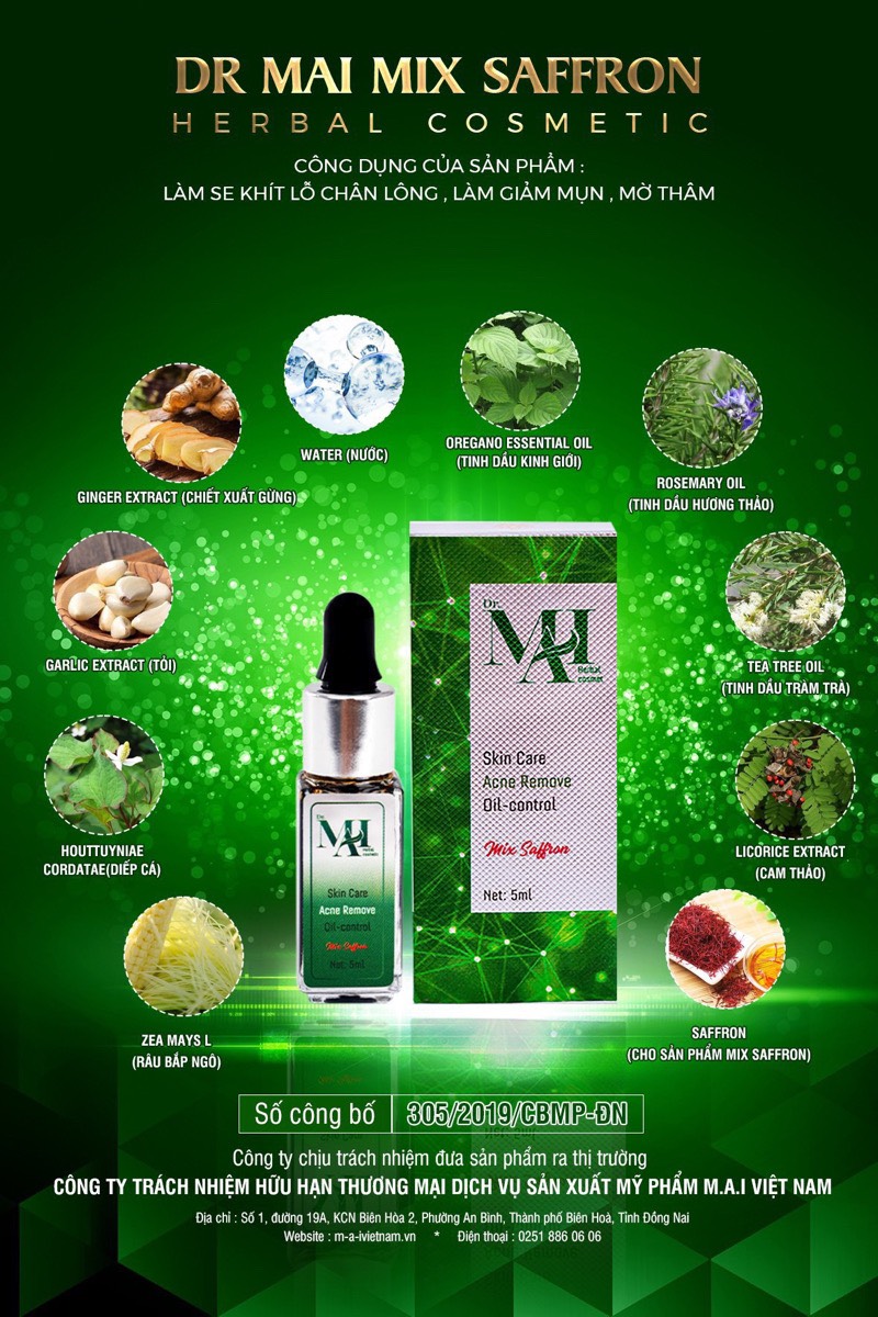 Mỹ phẩm trị mụn Dr Mai Nguyên Chất và Dr Mai Mix Saffron giúp hỗ trợ cải thiện làn da mụn với chiết xuất từ các loại thảo mộc thiên nhiên. Dr Mai là sản phẩm chủ lực, đánh dấu cột mốc thành công đầu tiên của thương hiệu mỹ phẩm làm đẹp tại công ty mỹ phẩm M.A.I Việt Nam. Đây cũng là đứa con tinh thần sau nhiều ngày dày công nghiên cứu của bà Nguyễn Thị Ngọc Thúy - Giám đốc Công ty TNHH Thương mại M.A.I Việt Nam. Với chiết xuất từ 9 loại thảo mộc thiên nhiên giúp hồi sinh làn da mụn trả lại làn da trắng sang mịn màng, giúp cải thiện làn da mụn thêm trắng sáng mịn màng. Sản phẩm được nghiên cứu và sản xuất dựa trên công thức gia truyền phù hợp với làn da mụn và cơ địa của người Việt.