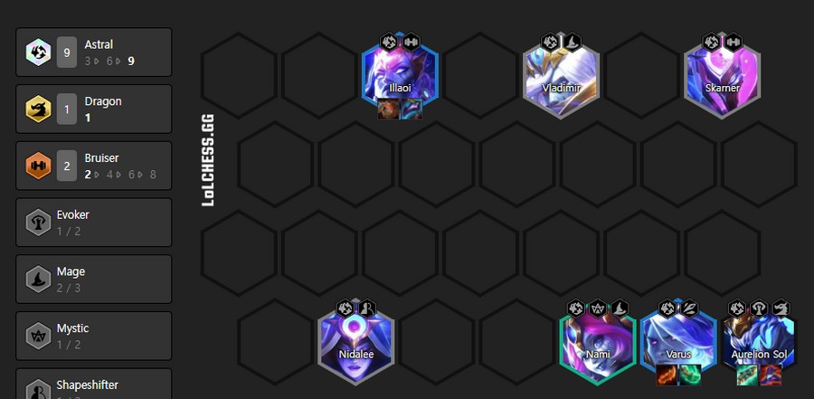 Và mốc 9 Astral thực ra lên rất dễ, vì tộc này có Aurelion Sol là tướng Rồng Thần sẽ được +3 vào tộc hệ hiện có, như vậy chỉ cần ở cấp 8 và có Aurelion Sol thì bạn sẽ kích được mốc 9 Astral rất dễ dàng. Cái còn lại thì Vé Hàng Hiệu là lõi công nghệ bậc 3 nên phải tùy hên xui, nhưng do DTCL mùa 7 cho phép bạn đổi lại lõi công nghệ một lần, nên tỉ lệ ra của nó cũng khá cao.
