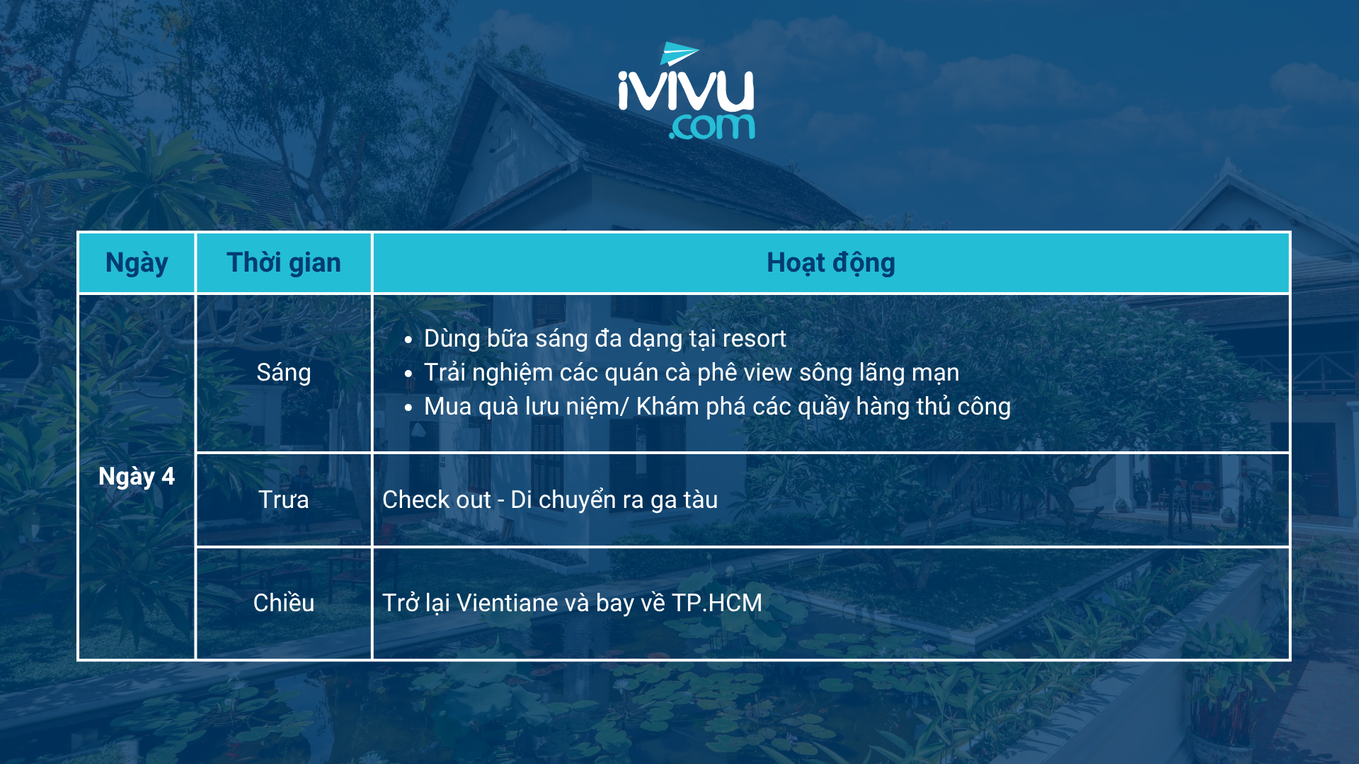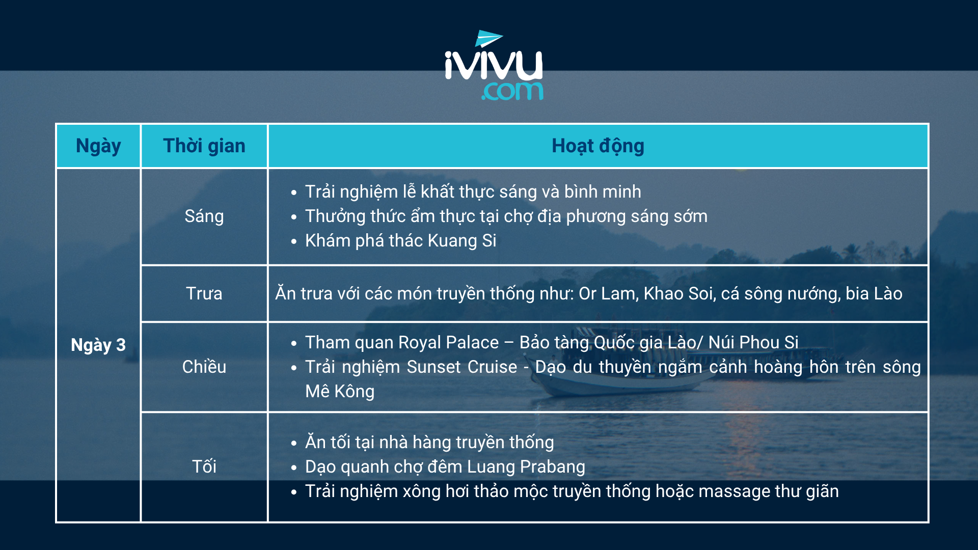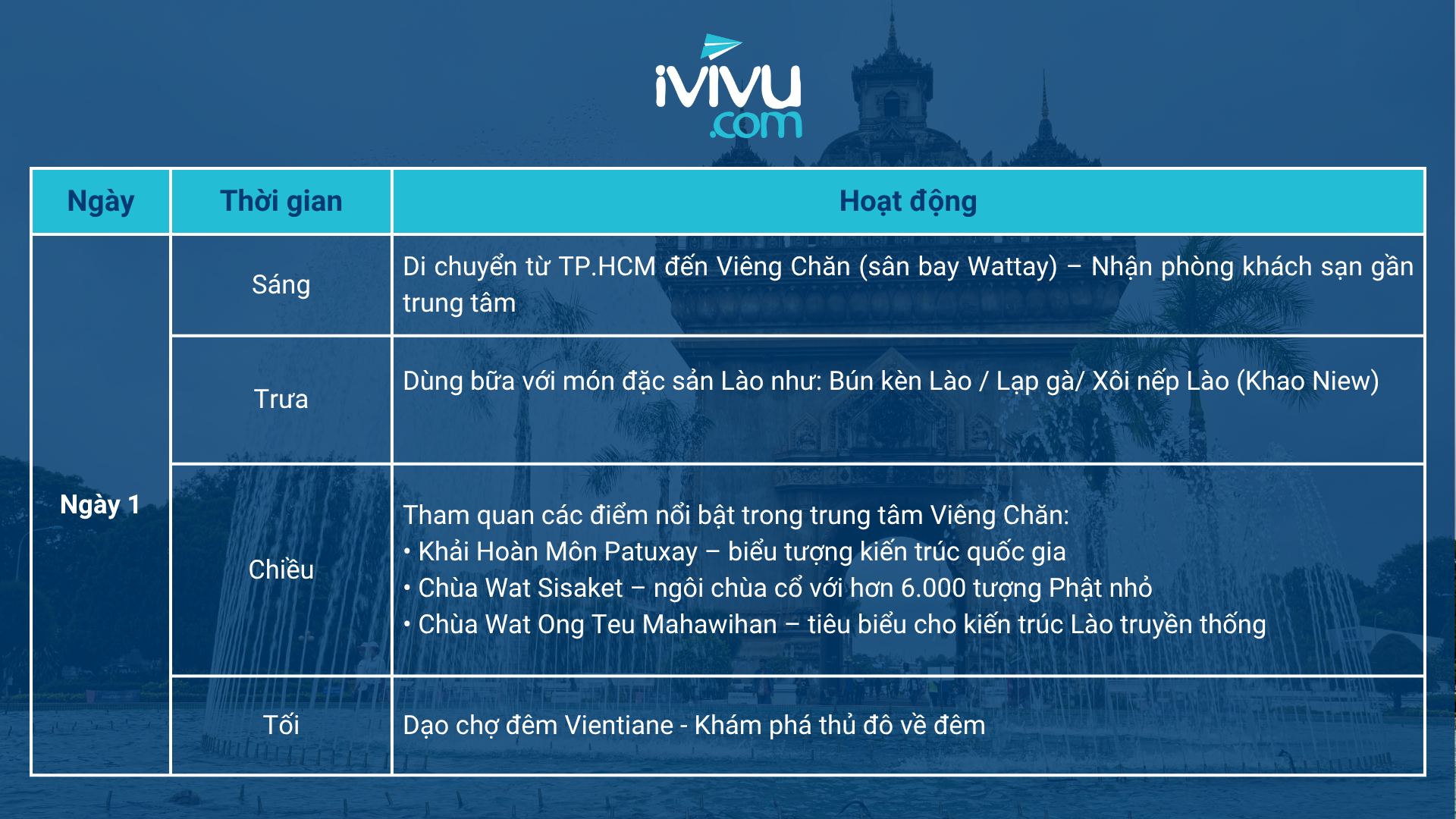 Nếu bạn đang lên kế hoạch cho chuyến du lịch Lào, hãy thử tham khảo lịch trình gợi ý chuyến đi 4N3Đ sau từ iVIVU.com. Khám phá trọn vẹn thủ đô nhộn nhịp Vientiane và phố cổ yên bình Luang Prabang.