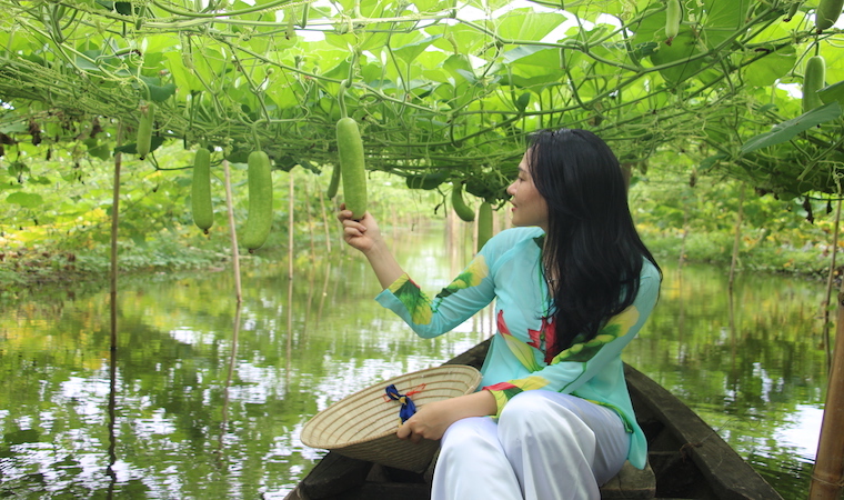 Khu vườn được thiết kế 2 giàn trên bờ và 1 giàn dưới nước phục vụ khách tham quan bơi xuồng chụp ảnh bên ruộng rẫy. Hiện tại, các giàn bầu bí này đang bắt đầu cho trái, ngoài thu hoạch trái để bán anh Tâm cũng dự kiến trồng bổ sung để duy trì lượng trái từ nay đến Tết nhằm phục vụ khách tham quan.