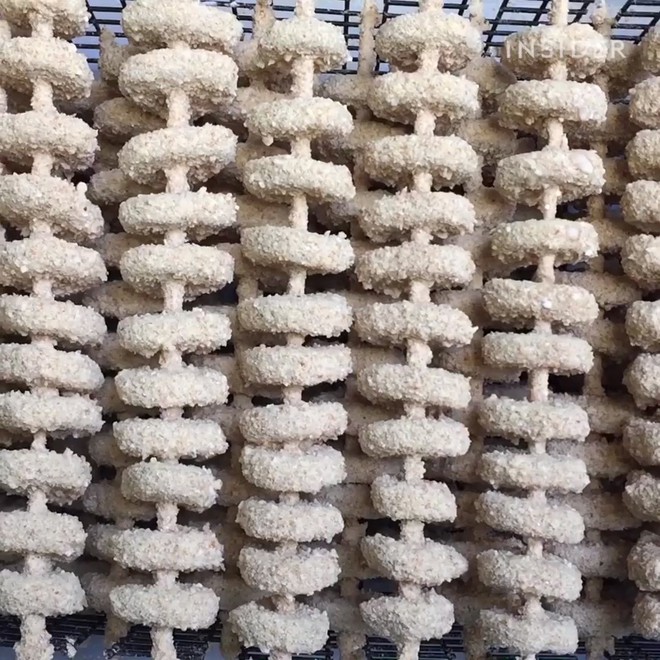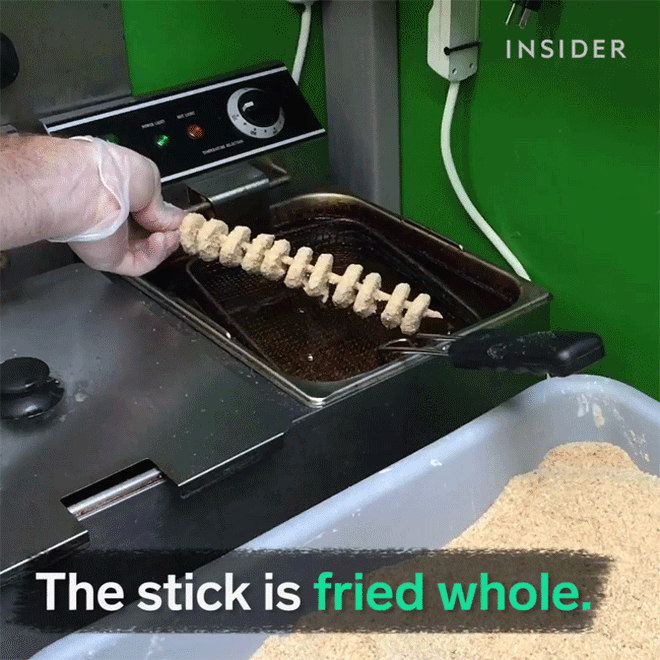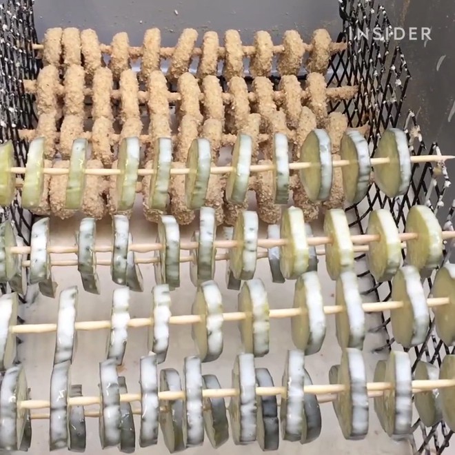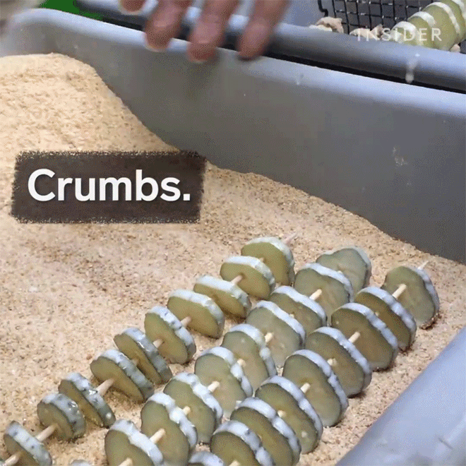Không chỉ có bột nhão mà xiên dưa chuột này còn được phủ thêm một lớp vụn bánh trước khi cho vào chảo dầu rán vàng. Nhờ có lớp bột bao phủ bên ngoài nên khoanh dưa chuột sẽ phồng to và trông đầy đặn hơn.