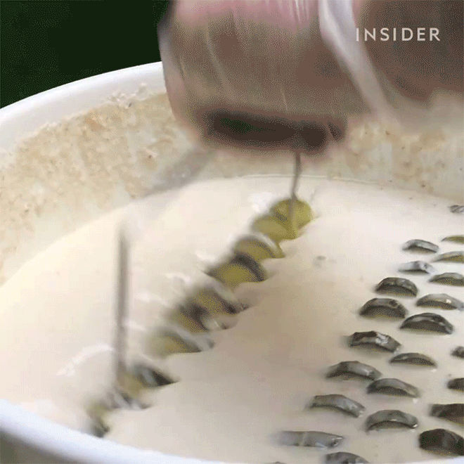 Sau đó, phần dưa chuột đã cắt khoanh tròn này sẽ được xiên que với khoảng cách các khoanh dưa chuột đều nhau. Sau khi đã xiên que xong thì que dưa chuột sẽ được mang đi nhúng vào bột nhão rồi để cho bột hơi ráo nước.