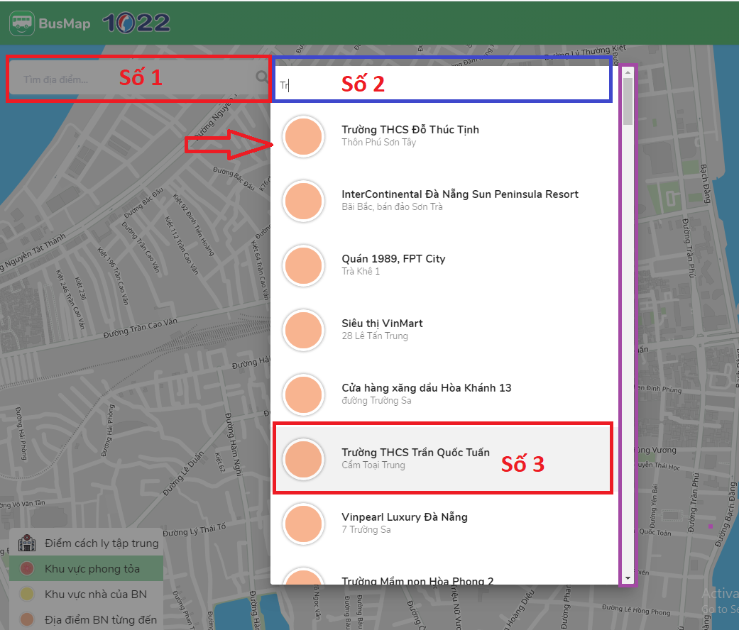 tìm kiếm (số 1) - Nhập vị trí tìm kiếm tại ô “Tìm địa điểm có nguy cơ lây nhiễm …” (số 2)