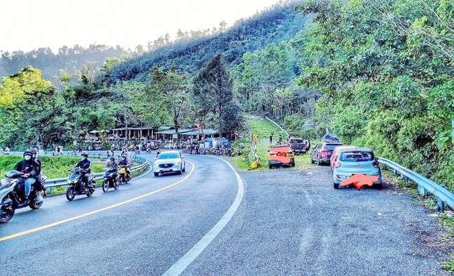 Nhiều xe máy và ô-tô đậu đỗ ngay đoạn đường trên đèo Hải Vân.