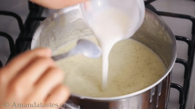 - Khi nước bắt đầu cạn, bạn rót toàn bộ phần sữa tươi còn lại vào nồi cùng vanilla. Đậy nắp và đun với lửa nhỏ trong 25 phút, cứ vài phút bạn mở nắp và khuấy đều để hỗn hợp không bị khét dưới đáy nhé!