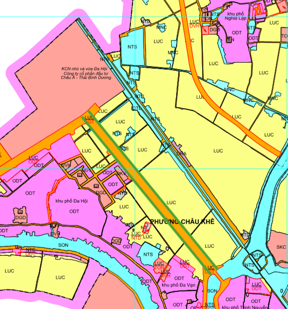 Quy hoạch phường Châu Khê theo bản đồ điều chỉnh quy hoạch sử dụng đất đến năm 2030 TP Từ Sơn, tỉnh Bắc Ninh. Ví dụ, đường kẻ viền màu xanh lá là đường giao thông được quy hoạch.