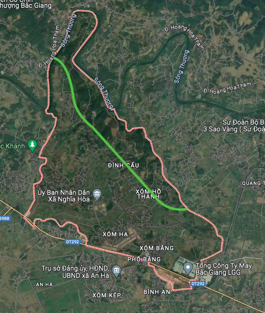 Ví dụ, trong hình dưới đây, phần đường kẻ viền xanh lá là một trong số những đường sẽ mở ở xã Nghĩa Hòa trong tương lai: Đoạn đường chạy dọc qua địa bàn phía đông của xã Nghĩa Hòa. Trong phạm vi xã, đoạn đường có một đầu ở sông Thương, đầu còn lại ở gần thôn Hồ Thanh.