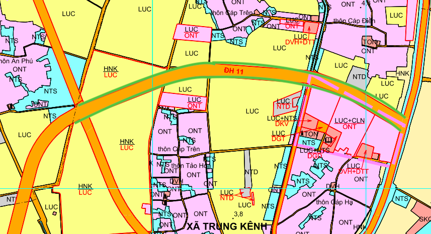 Quy hoạch xã Trung Kênh theo bản đồ điều chỉnh quy hoạch sử dụng đất thời kỳ 2021-2030 huyện Lương Tài, tỉnh Bắc Ninh. Ví dụ, đường kẻ viền màu xanh lá là đường giao thông được quy hoạch.