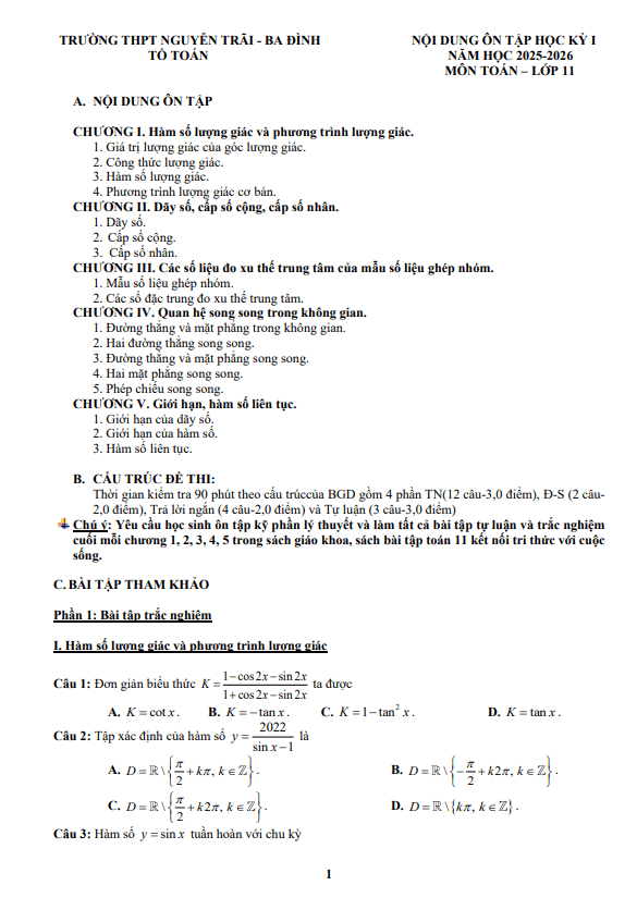Ôn tập học kỳ 1 Toán 11 năm 2025 – 2026 trường THPT Nguyễn Trãi – Hà Nội 16/12/2025
