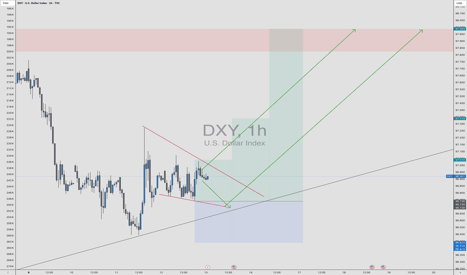 Dollar - Daily CLS - Model 1 - HTF FrameworkHi friends, new range created. As always we are looking for the manipulation in to the key level around the range. Don't forget confirmation switch from manipulation phase to the distribution phase to make the setup valid. Stay patient and enter only after change in order flow. If price reaches 50% Longby David_Perk161636DXY 1W — Weekly Impulse Completed, Compression Before ExpansionFundamental Snapshot The 2026 narrative still supports a softer USD: rate-cut expectations + shrinking yield advantage + capital rotation. Bounces can happen, but until major weekly highs are reclaimed, the macro backdrop stays corrective-to-bearish. My Bias The weekly impulse from the maby GForecast88911.02.26 Daily ForecastPairs on Watch - FX:NZDUSD FX:EURCAD A short overview of the instruments I am looking at for today, multi-timeframe analysis down to what I will be looking at for an entry. Enjoy! 11:42by JordanWillson5529DXY Coiling for Expansion — Liquidity Grab Before the Move?DXY is currently compressing inside a descending wedge while holding above a rising trendline — a classic accumulation structure. Price swept liquidity to the downside and reacted from higher-timeframe support, suggesting sellers are weakening. As long as the trendline holds, the probability shiftsLongby MartynasMG220Falling towards overlap support?US Dollar Index (DXY) is falling towards the pivot, which has been identified as an overlap support that aligns with the 61.8% Fibonacci retracement. Pivot: 96.43 1st Support: 96.05 1st Resistance: 97.23 Disclaimer: The opinions given above constitute general market commentary and do not constitLongby IC Markets117If BUY Bias on DXY On lower Daily timeframe there is an ABCDE expanding triangle patten right along the Weekly up trend S&R and Weekly horizontal S&R ..So now am waiting for cross above the 101 to confirm long term BUY BIAS by Majuri-TK1110DXY – H4 | Short-Side Technical ContextThe U.S. Dollar Index recently completed a corrective bullish channel following a strong impulsive decline. Price respected the rising channel structure but failed to sustain acceptance near the upper boundary, indicating weak continuation strength. A decisive move lower has now occurred, with pricShortby Selena_FX_TraderUpdated 115DXY: Lower lows or are we due for a bounce?Will the decline in US Unemployment boost TVC:DXY , or will the probability of further rate cuts push the price below support? Let's break down both scenarios and prepare a trading plan for either outcome. Technicals: - after tagging the 0.618 Fibonacci retracement, price action faced a sharp by TotSamiyKaa225Dxy about to fall Dxy is retesting the breakdown when it's complete it should start to fall 91 - 90 is the Target.Shortby CryptoVhagar334US DOLLAR INDEX (DXY): Classic Breakout TradeThe Dollar Index successfully broke and closed above a significant daily horizontal resistance cluster earlier this week. Following this, the pair started to consolidate on a 4-hour timeframe, retesting the previously breached structure. A bullish breakout of this consolidation serve as a strongLongby linofx12211