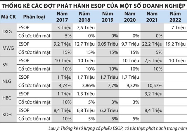 Nhìn chung, các doanh nghiệp phát hành ESOP trong nhiều năm thì cổ đông chỉ nhận được mức cổ tức khiêm tốn so với thị giá, thậm chí nhiều doanh nghiệp như DXG không trả cổ tức tiền mặt.
