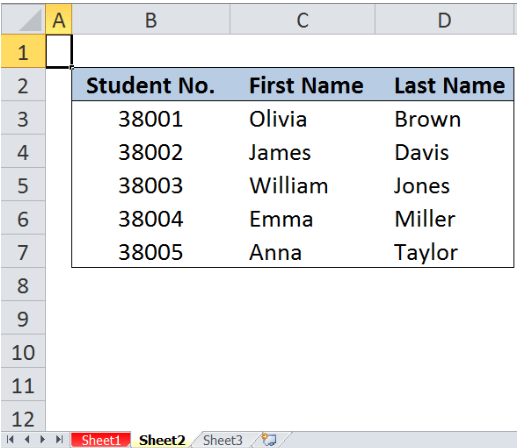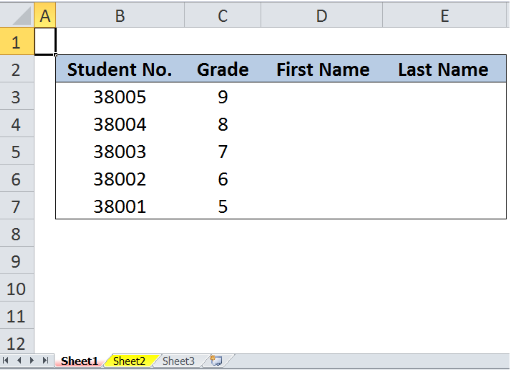 In Sheet2, we have a list of student numbers and corresponding first and last names.