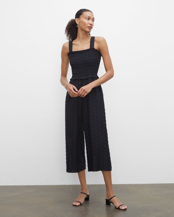 Article contentWe’ve said it a million times, but we’d be happy to say it a billion: is there anything not to love about a jumpsuit? Sure, there may be that awkward moment when you realize you’re essentially sitting naked in the bathroom, but bar that slightly exposing feeling, a jumpsuit is a true wardrobe essential. This smocked style with tonal polka-dots is comfortable and pulls on easily; wear it with flat or low-heeled sandals depending on where you’re heading and why.