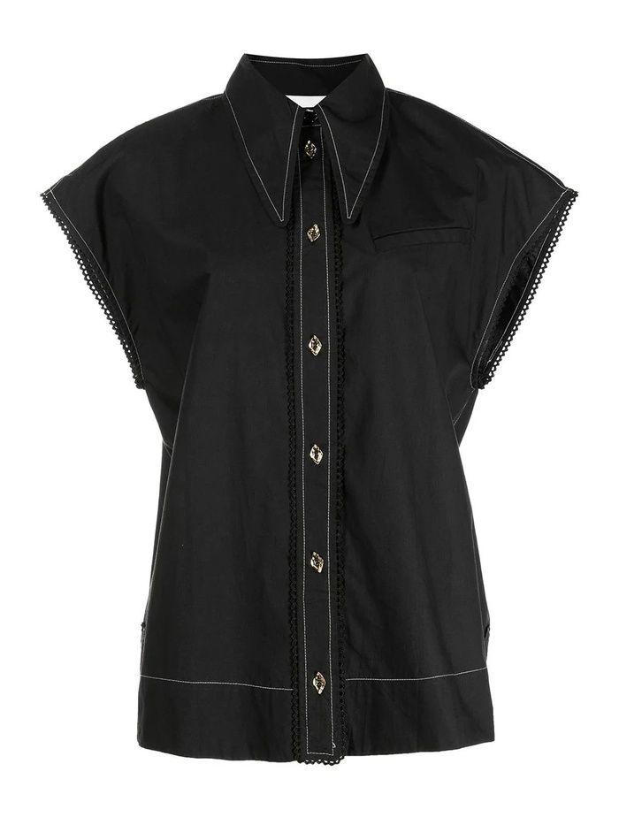 Article contentFrom Ganni, the brand that appears unable to do any wrong when it comes to their collections, comes this sleeveless cotton poplin shirt with a dramatic pointed collar. Made from 100 per cent organic cotton, with cap sleeves, gold-coloured buttons and a subtle, scalloped lace hem, it also has wide, open shoulders for a dramatic finish.